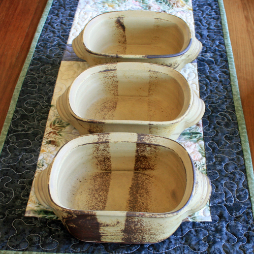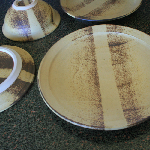 Eight-piece stoneware dinner set with dry glaze in shades of light tan and brown divided by a narrow band in a lighter colour.