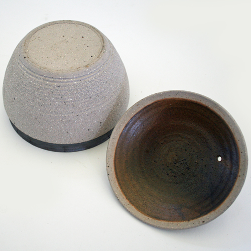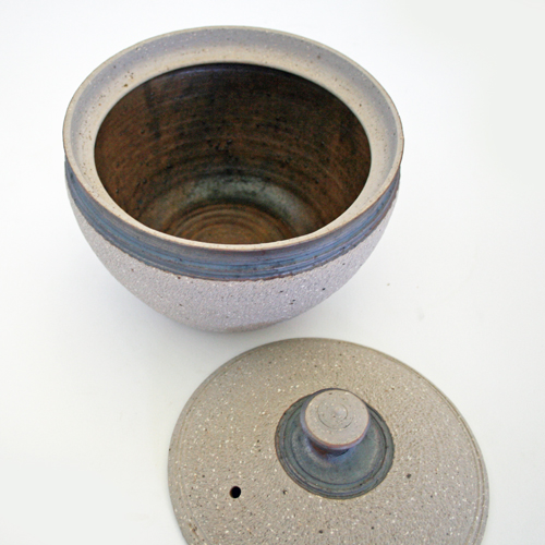 Pale grey stoneware lidded pot, glazed brown inside and in a stripe around the ridged rim and lid, with unglazed exterior surfaces finely chattered.
